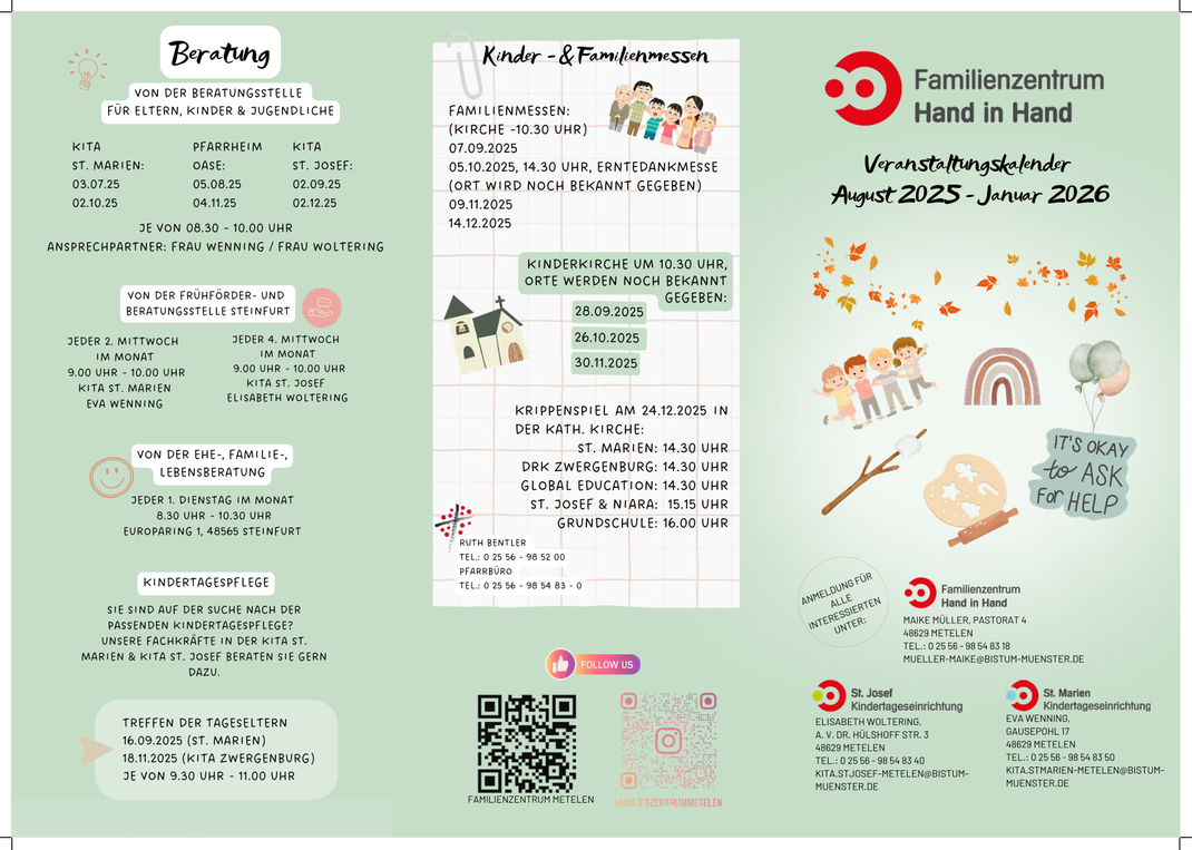 Das zertifizierte Familienzentrum „Hand in Hand“ besteht seit 2009 aus den kath. Kitas St. Marien und St. Josef im Verbund. Über die Kindertageseinrichtungen hinaus bietet es zusätzliche Angebote für Familien und Bürger in und um Metelen, unabhängig von Nationalität und Herkunft, von Konfession und Alter. Hier werden Kinder, Jugendliche, Familien und Senioren beraten, gefördert und unterstützt in unterschiedlichen Lebenslagen und mit unterschiedlichen Bedürfnissen. Mit unseren verschiedenen Kooperationspartnern haben wir die Möglichkeit, eine große Vielfalt an Angeboten machen zu können. Unsere Angebote finden sich in folgenden Leistungsbereichen wieder:
