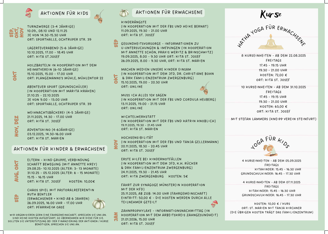 Die Angebote werden in einem, 2mal jährlich erscheinendem Flyer und hier auf der Homepage präsentiert.