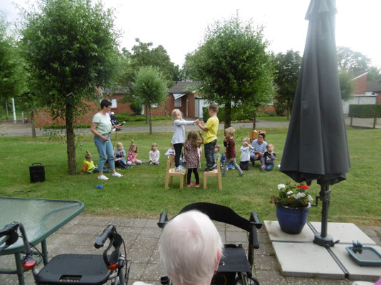 Um den Bewohnern und Bewohnerinnen des Ida-Hauses eine Freude zu bereiten, haben die Kinder die Senioren besucht und ihnen mit zwei Spielliedern Freude bereitet.