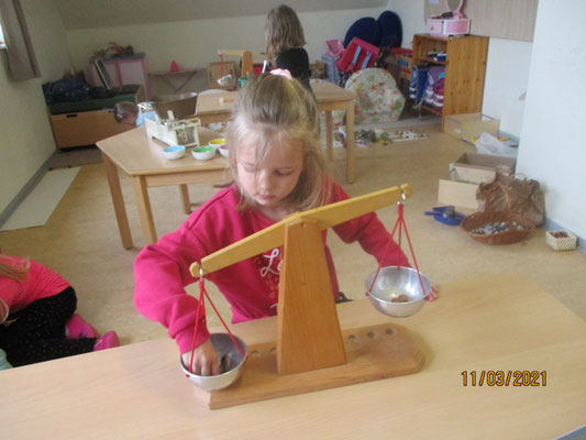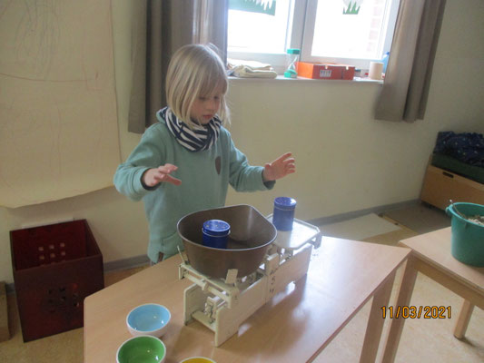 Auch wenn unserer Riesen bereits gut zählen - und ihre Spielkameraden mit Rechenaufgaben beeindrucken können, haben sich alle 13 zukünftigen Schulkinder intensiv in einem Projekt mit Zahlen, Mengen, Formen, Größen und Wiegen beschäftigt. Hier wurde sich mit dem Zahlenraum bis 10 befasst und somit die einzelnen Zahlen nach der Reihenfolge kennengelernt. Vorgänger und Nachfolger wurden bestimmt, Zahlen als Mengen erlebt um diese unterschiedlichen Mengen miteinander zu vergleichen und dadurch "weniger" und "mehr " zu erkennen. Zudem standen geometrische Formen in engem Zusammenhang zu den Zahlen: ein Dreieck hat drei Ecken und ein Viereck kann ein Quadrat oder ein Rechteck sein. Auch lernten die Kinder erkennen, dass beispielsweise zwei kleine Kreise und zwei große Kreise die gleiche Menge ergeben. Die beeindruckenden Ausmaße von Elefant, Giraffe, Schlange oder Krokodil wurde mit Bändern 1:1 dargestellt.