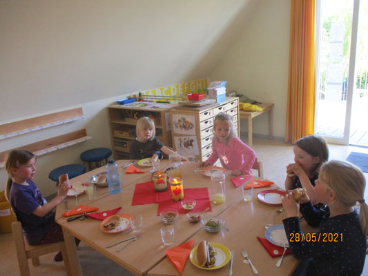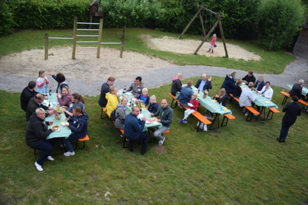 Glücklicherweise machte der Regen eine Pause, so dass auf dem Außengelände alle Kinder und Erwachsenen zum Ausklang gemütlich beisammen sitzen konnten.