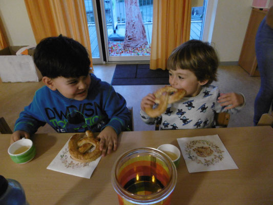 In der Einrichtung wurde die Geschichte von Martin und der Mantelteilung immer wieder gelesen und gespielt und am Martinstag waren alle Kinder eingeladen mit ihren bunten Laternen in die Kita zu kommen um hier gemeinsam einen gemütlichen Nachmittag bei Punsch und Brezeln zu verbringen.